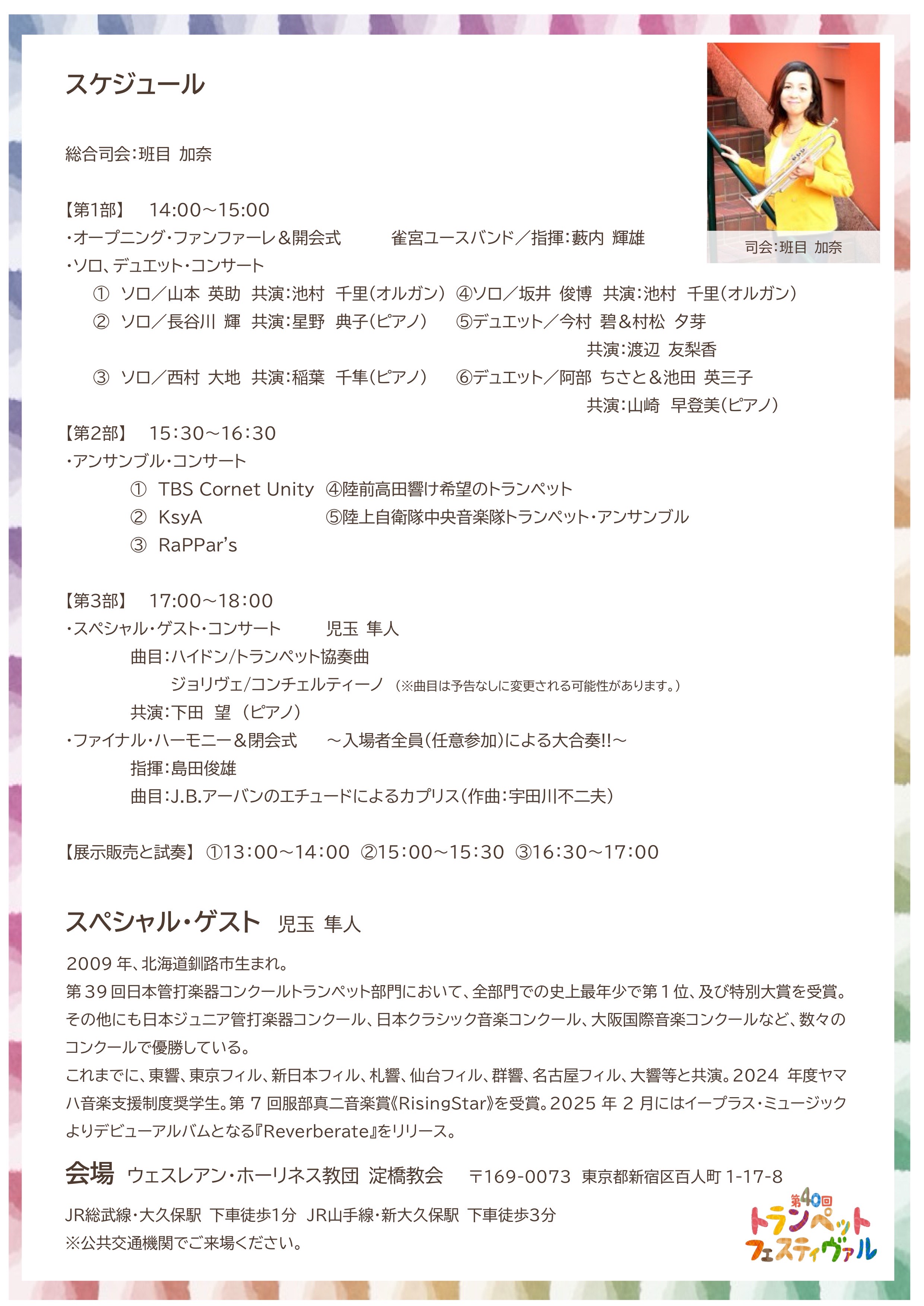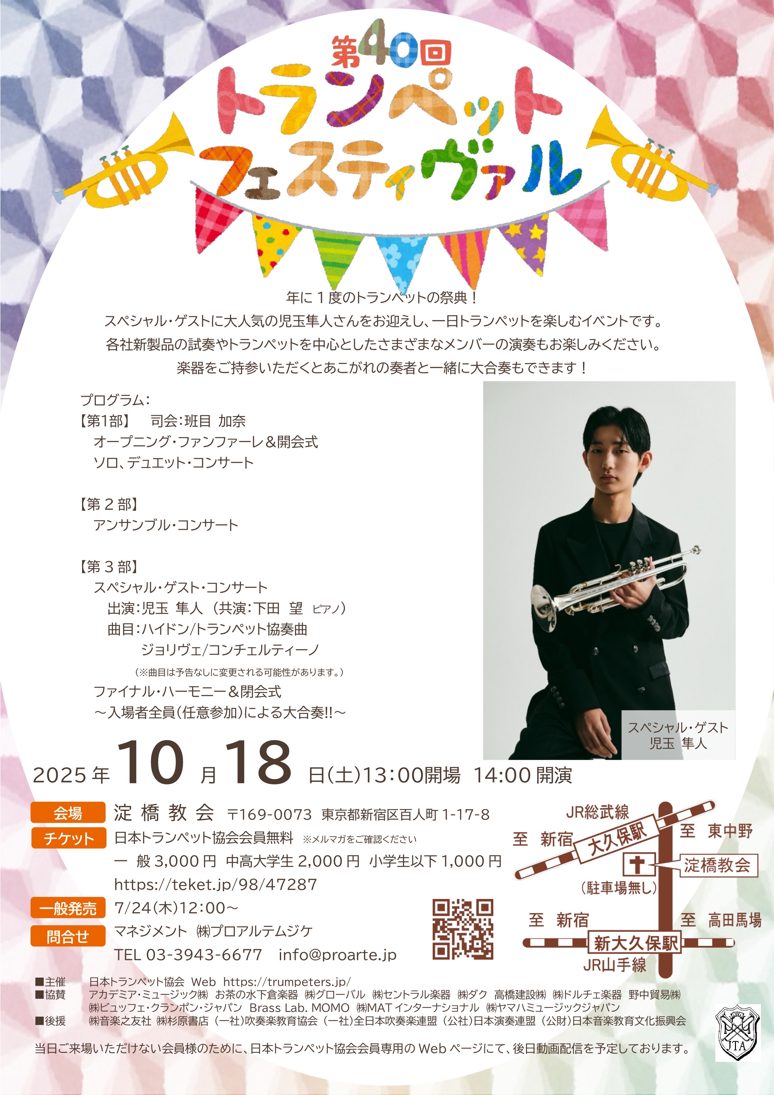 ・ 日本トランペット協会「第40回トランペット・フェスティヴァル」(2025/10/18(土) 14:00開演、新宿 淀橋教会)を追加しました。(チラシ表、チラシ裏) (JTA会員はメルマガでお知らせしている会員サイトから申し込みください。現在も申し込み可能です。)