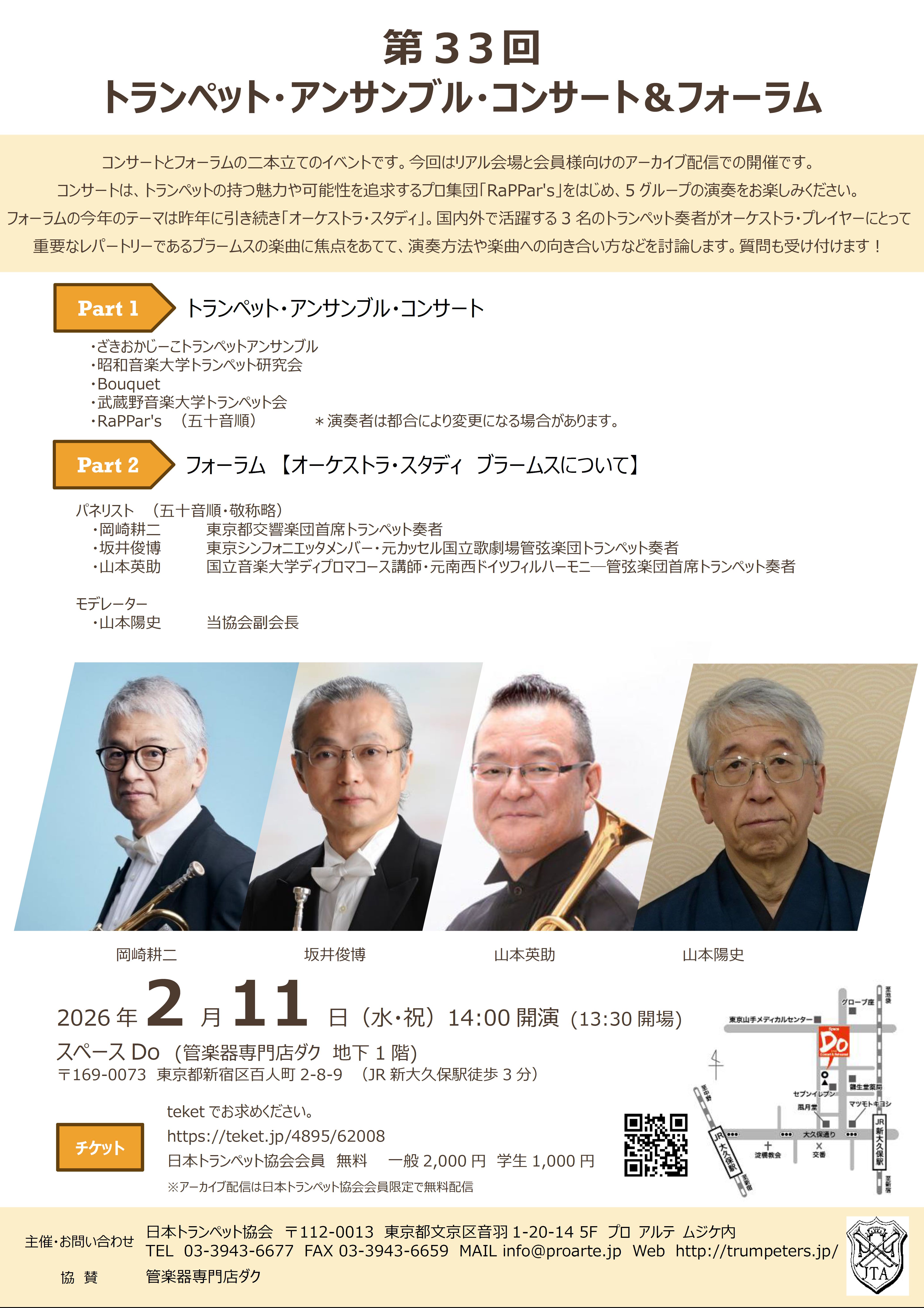 ・第33回 トランペット・アンサンブル・コンサート&フォーラム(2026年2月11日(水・祝) 14:00 開演,管楽器専門店ダク 地下1階 スペース Do)を追加しました。(チラシ)