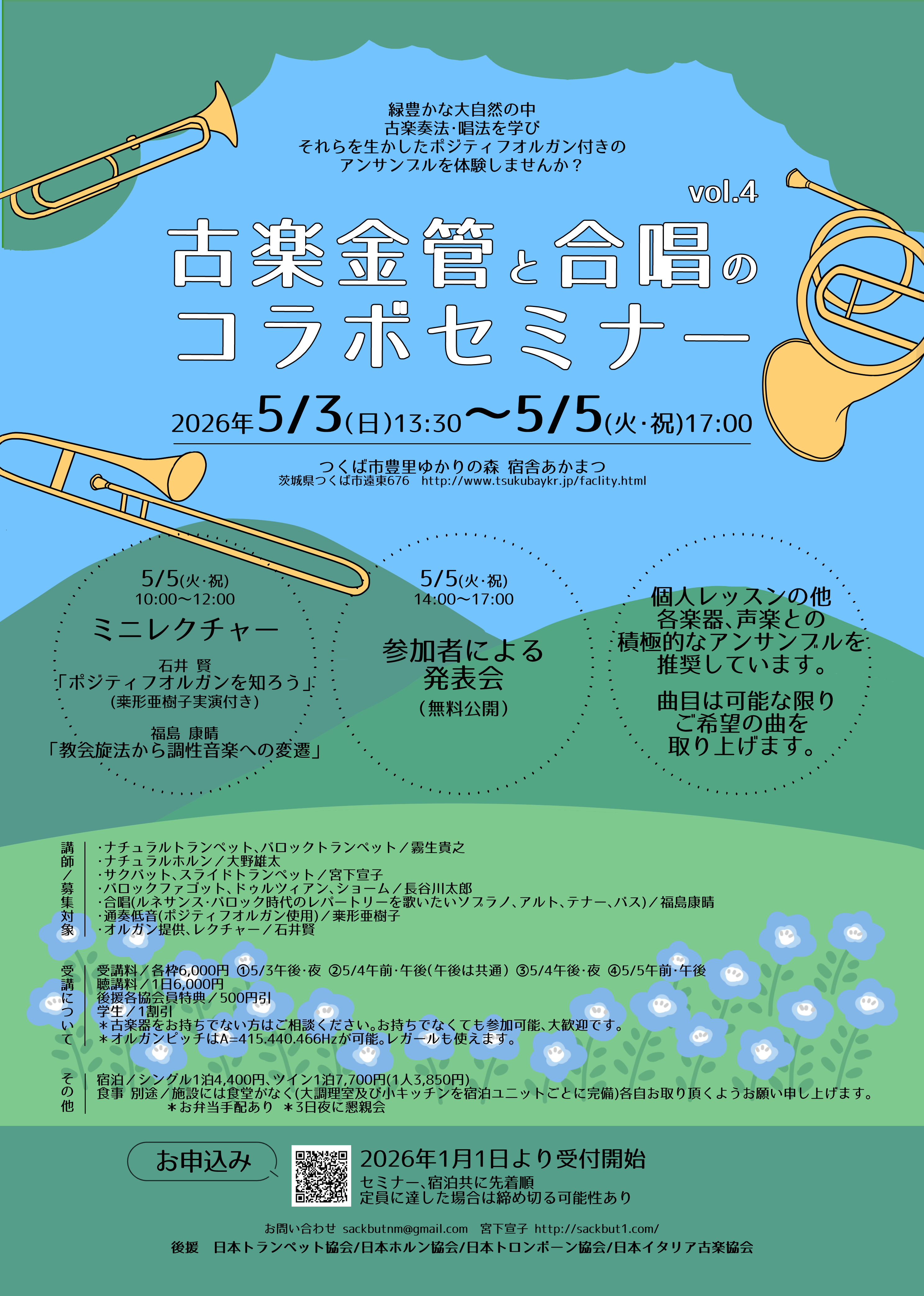 ・2026年 古楽金管と合唱のコラボセミナーvol.4(2026年5月3日(土)13時半〜5日(月・祝)17時,つくば市豊里ゆかりの森 宿舎あかまつ)を追加しました。(チラシ)